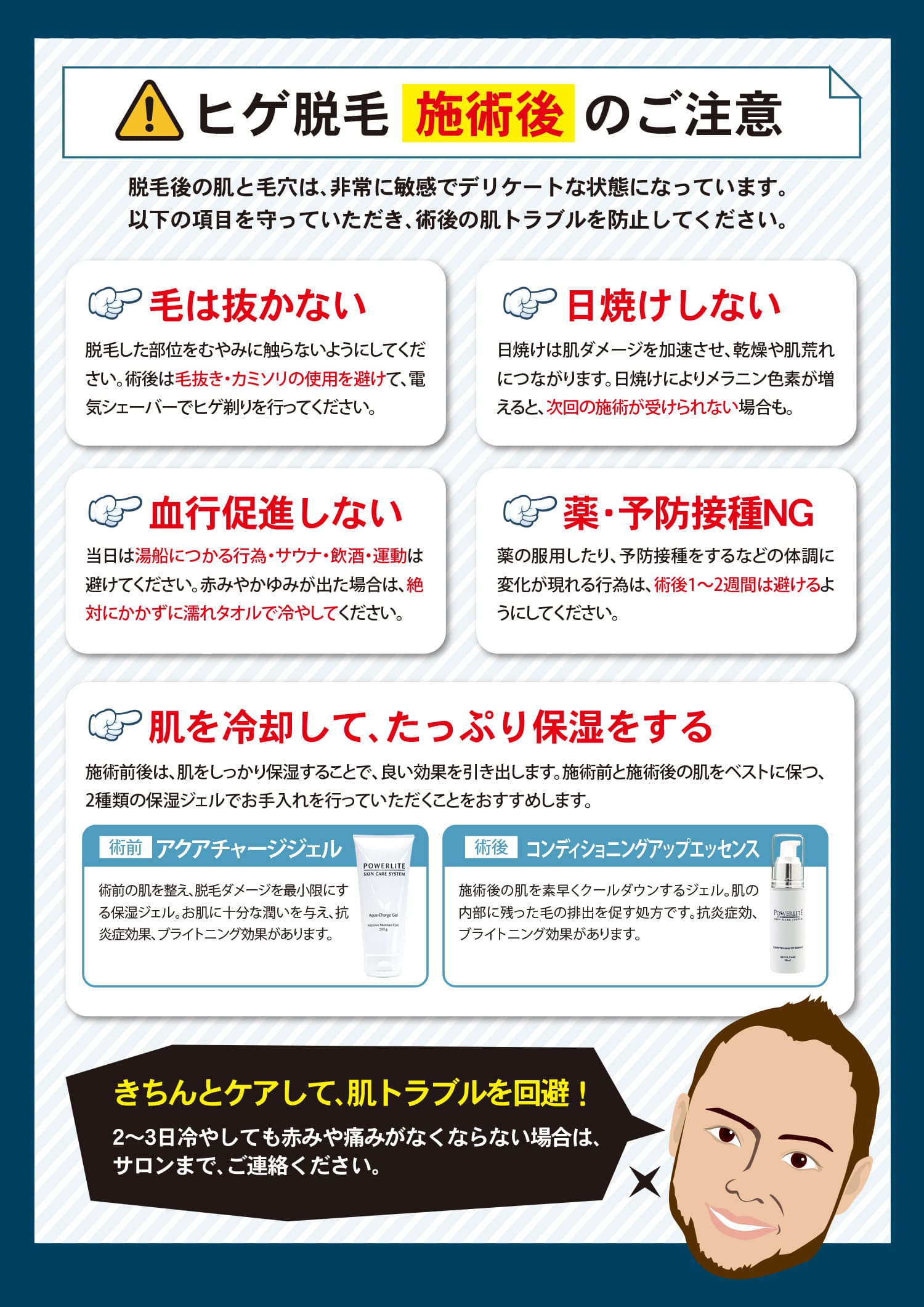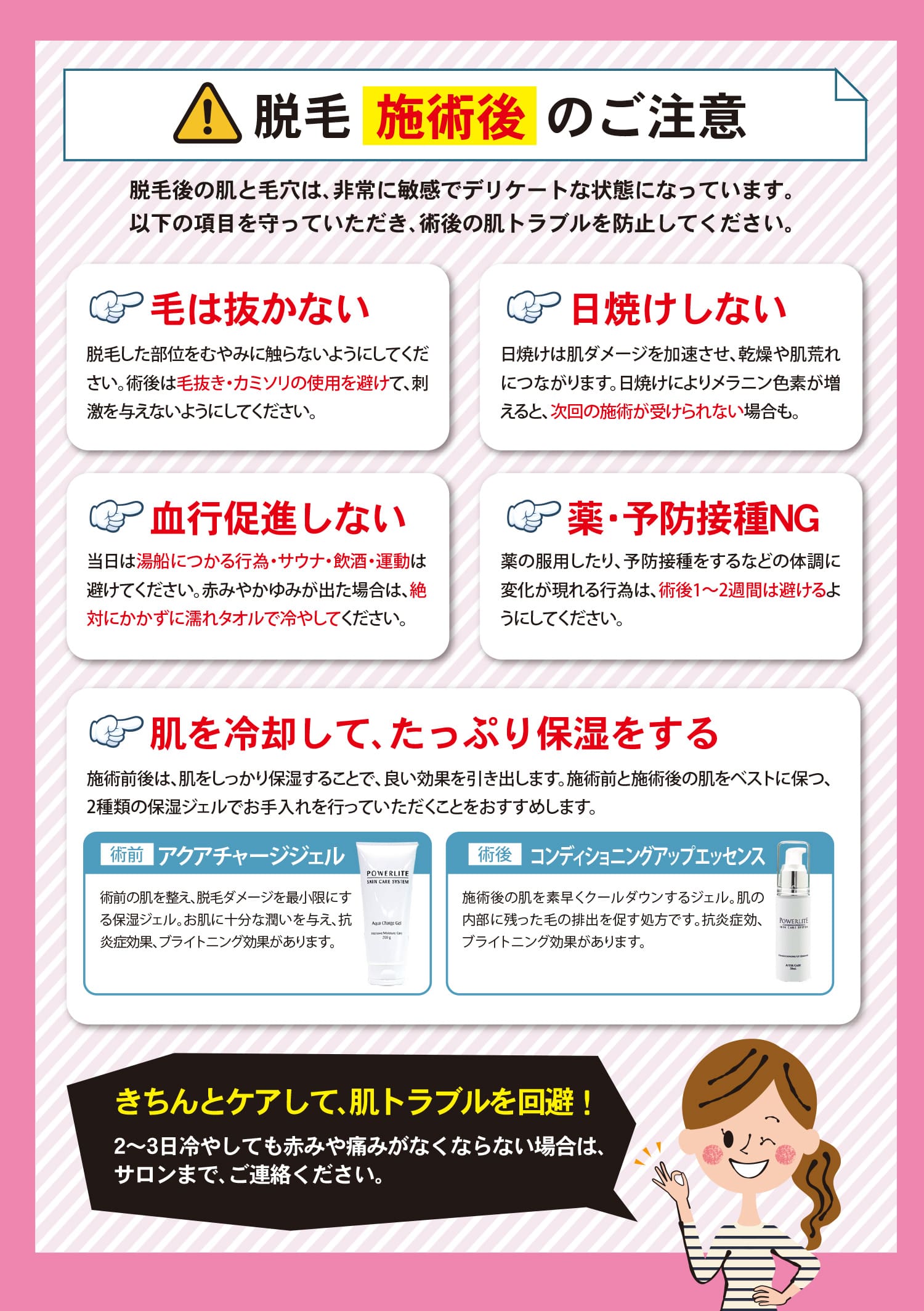 施術後の注意点 | 毛抜き、カミソリは使用しないでください。血行促進× 日焼け× |